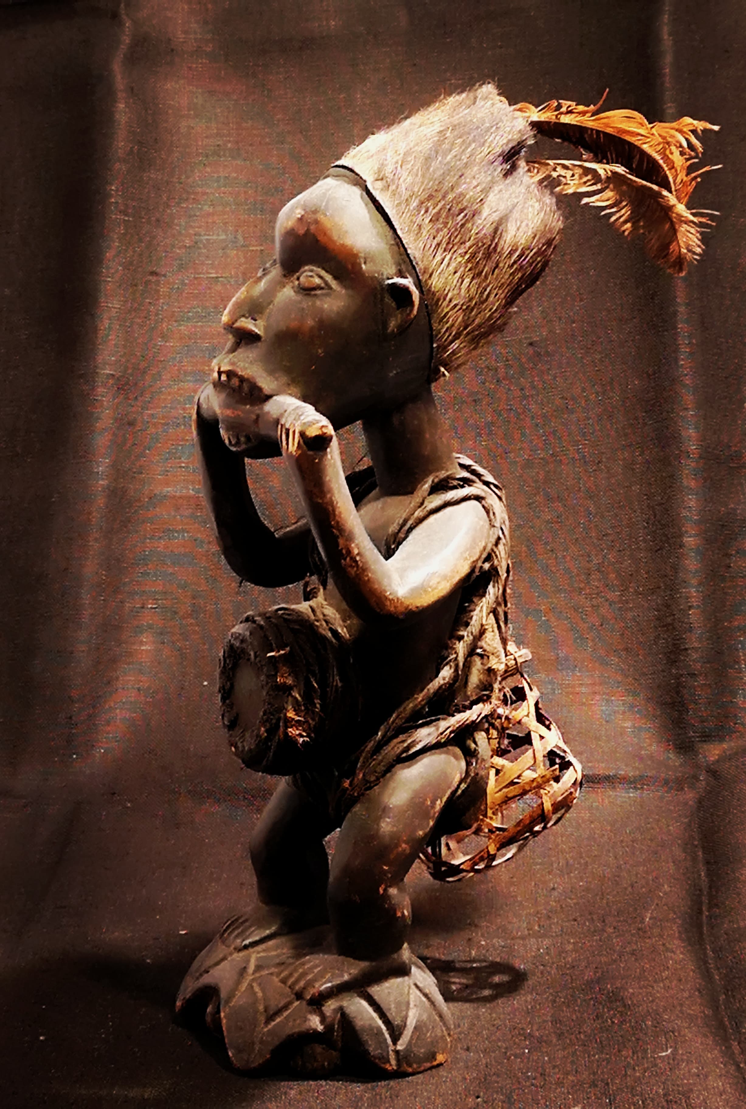 Gammel fetisj figur fra Bakongofolket fra D.R.Kongo. Spesiell og helt unik; bÃ¥ret av en skilpadde, gnagende pÃ¥ et bein, med en stor magisk beholder ("Bilongo") pÃ¥ magen, bæresele for/med andre magiske elementer pÃ¥ ryggen, og en hodepynt sammensatt av dyrepels og fjær. Et sjeldent og facsinernde kunstverk i god, original stand.Â
