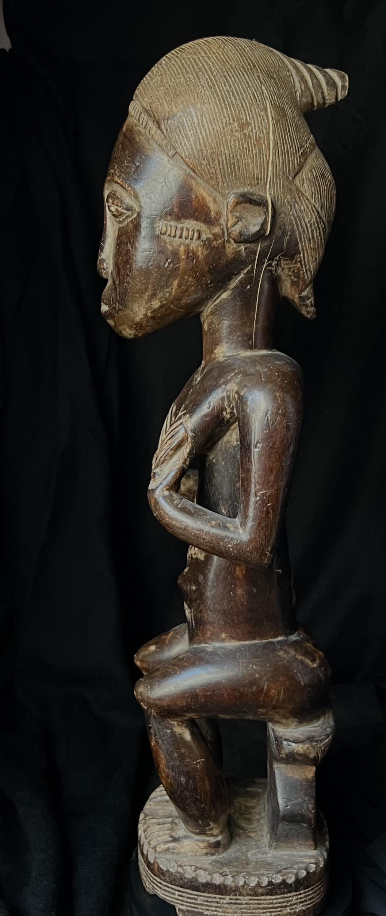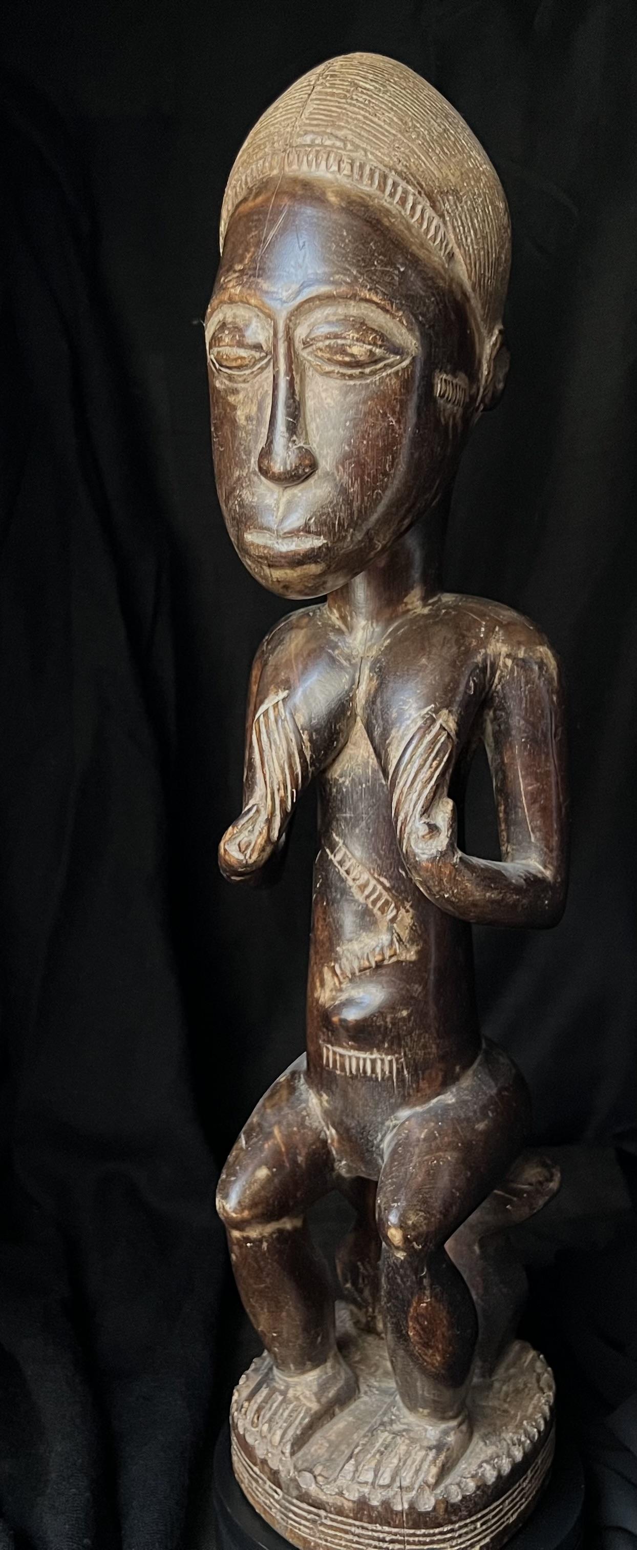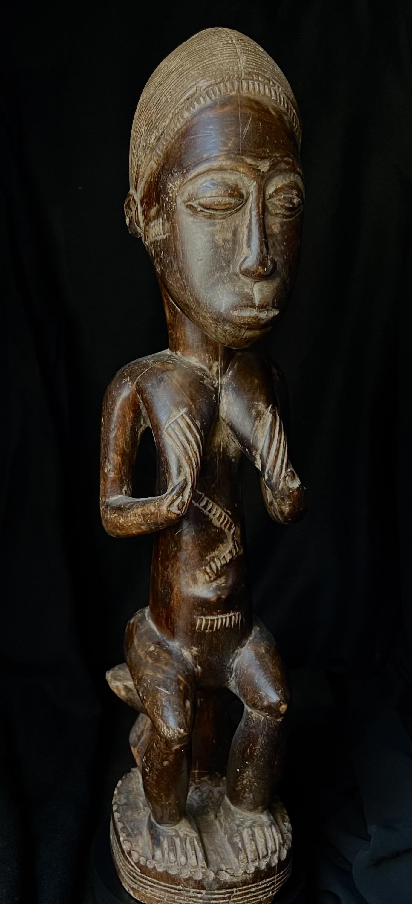 Meget vakkert skåret, og stor figur, med et svært fint og rolig uttrykk. Flott patina. Holdningen understreker ønsket om-, og betydningen av fruktbarhet, og har sannsynligvis hatt som oppgave å fremme fruktbarhet i samfunnet.