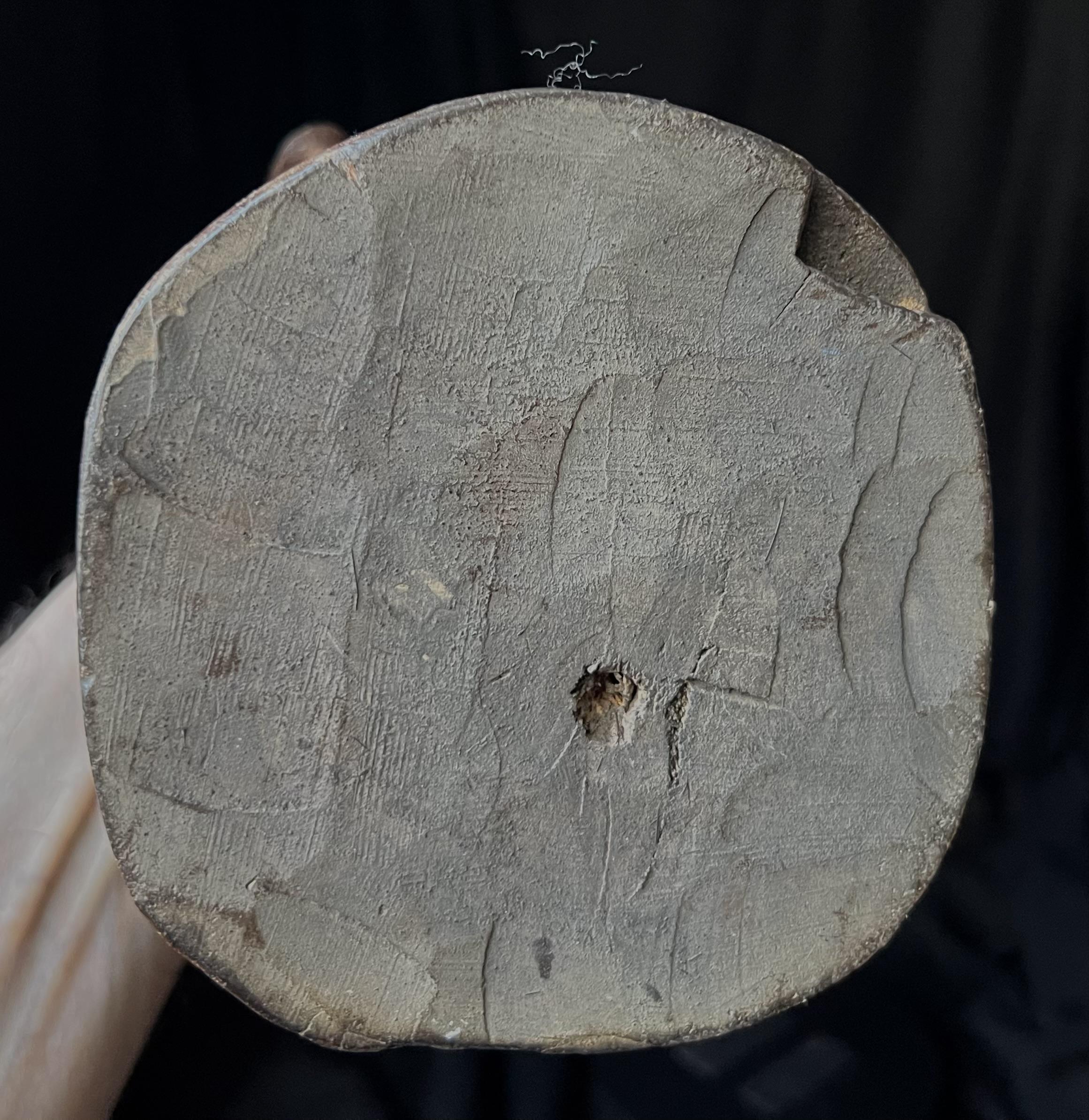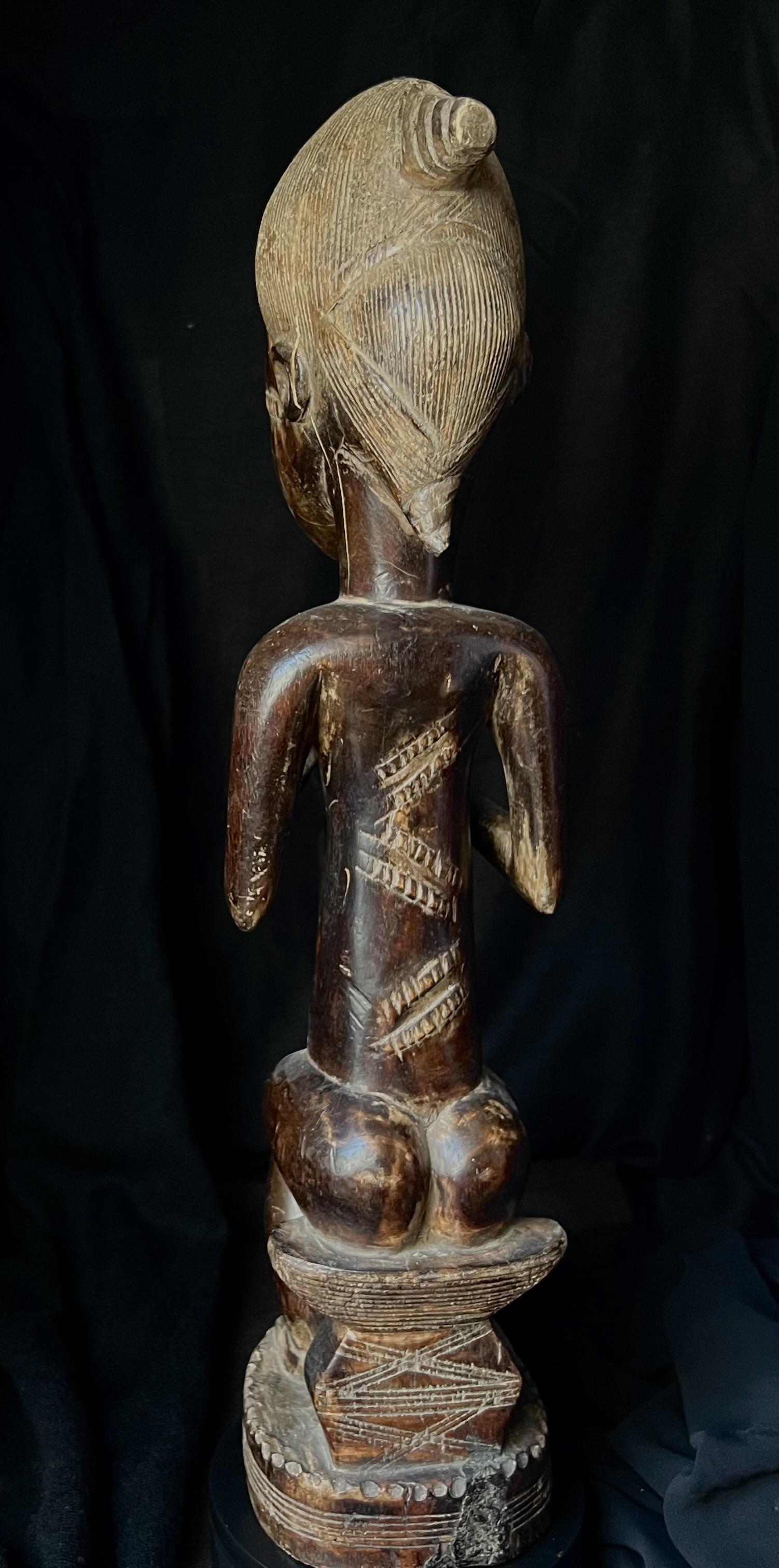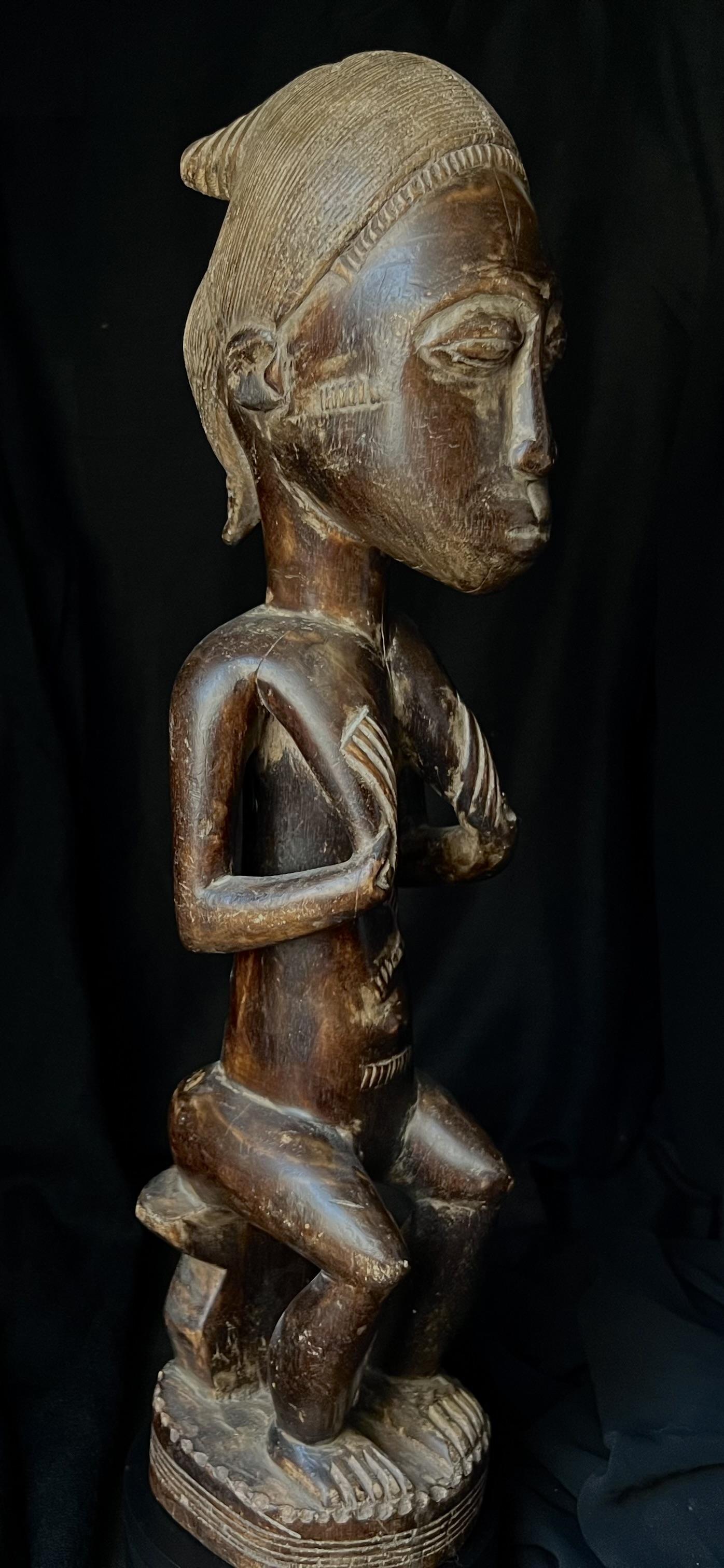 Meget vakkert skåret, og stor figur, med et svært fint og rolig uttrykk. Flott patina. Holdningen understreker ønsket om-, og betydningen av fruktbarhet, og har sannsynligvis hatt som oppgave å fremme fruktbarhet i samfunnet.