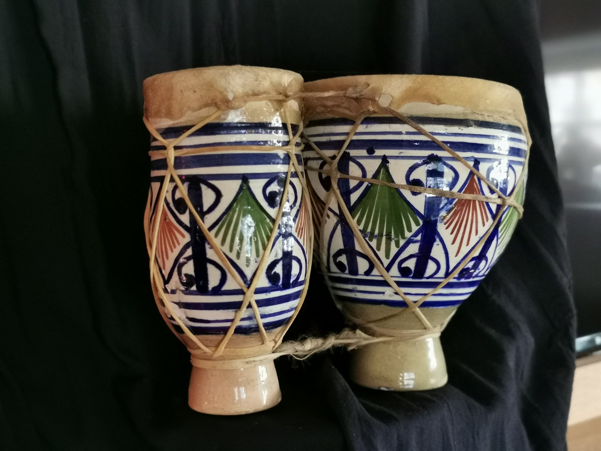 Tam tam tromme av keramikk fra Marokko, tradisjonell dekor med geiteskinn. I god stand.
