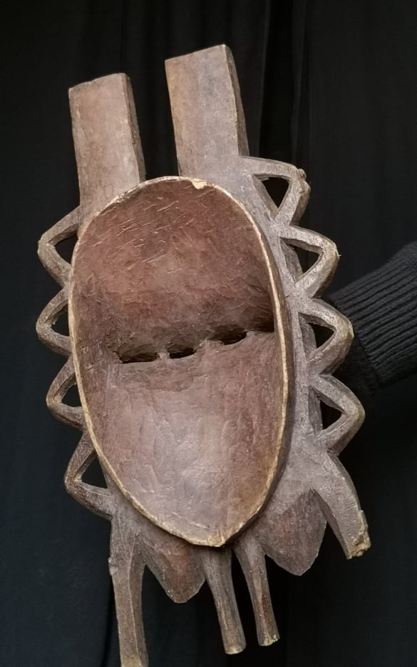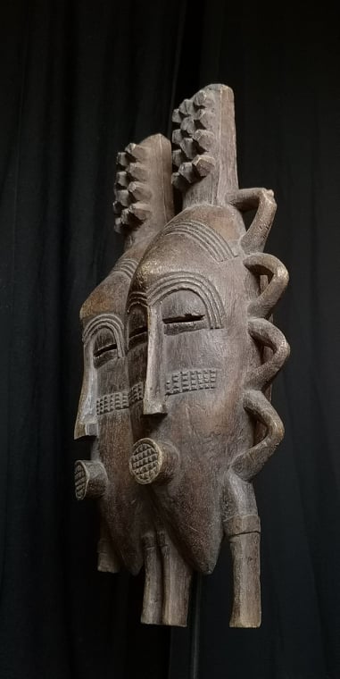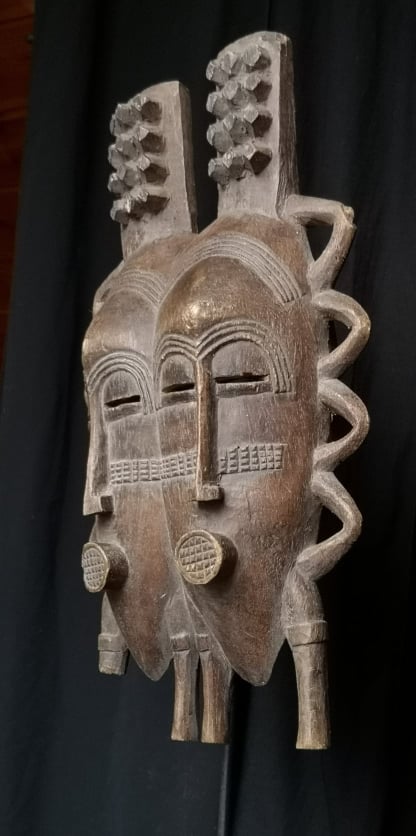 Senufo dobbelmaske med fin patina, med en liten skade, en avbrukket pinne på en side. Se bilde.