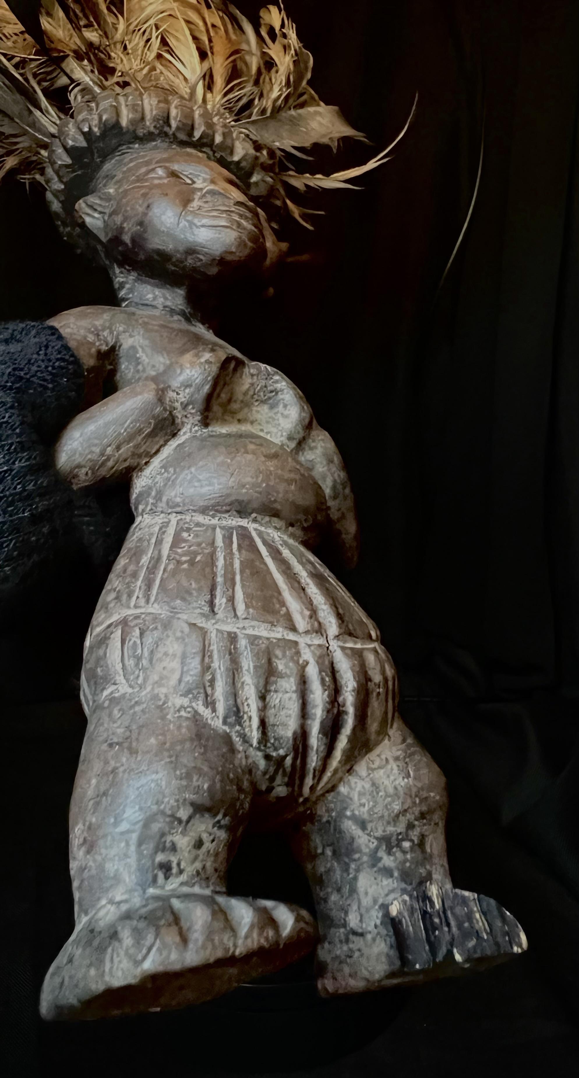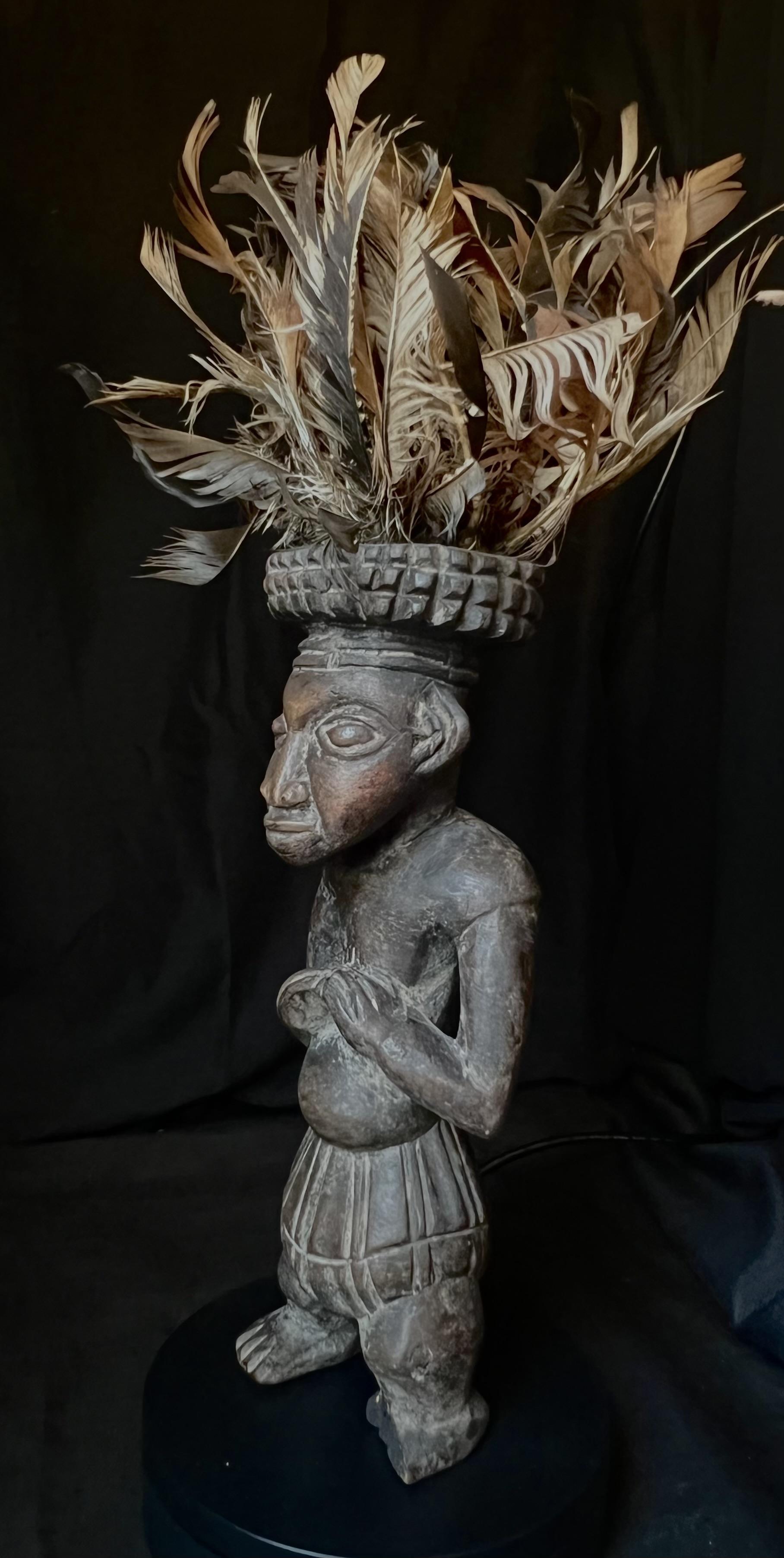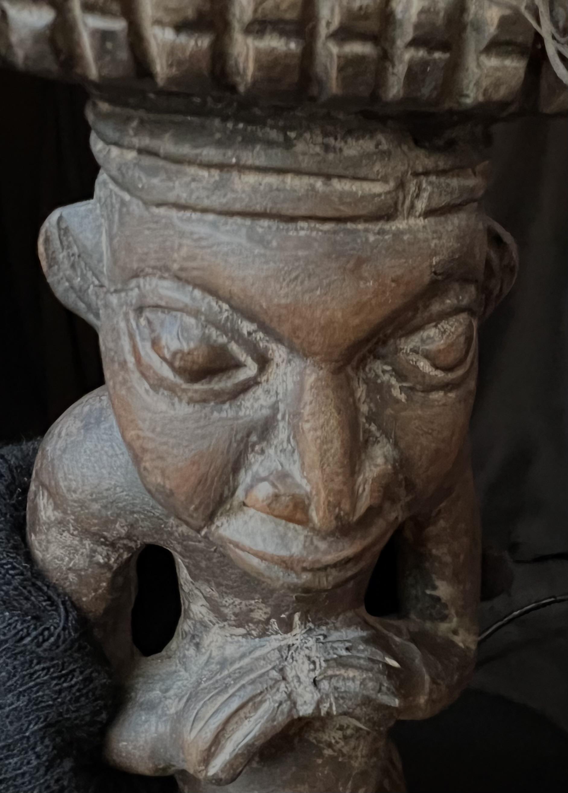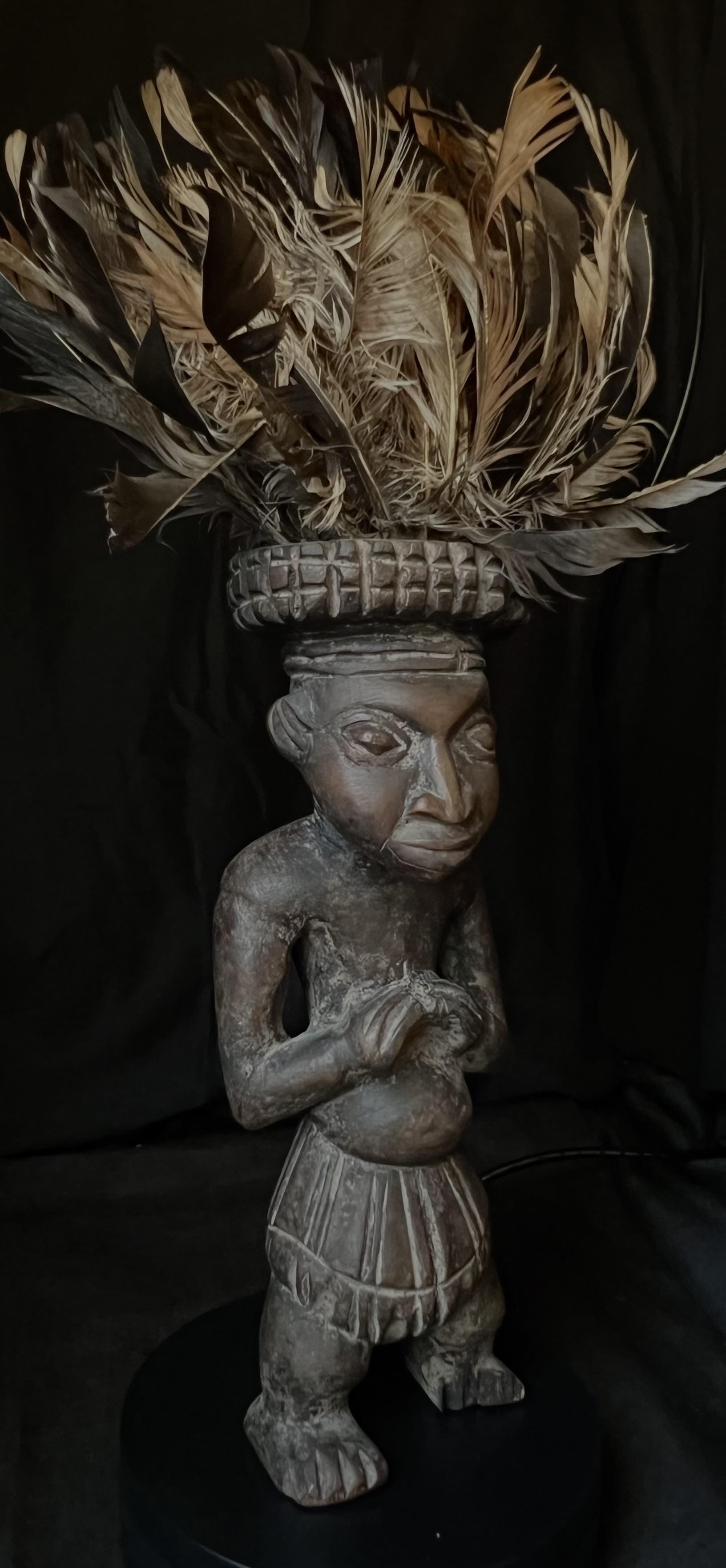 En meget dyktig sk[ret figur fra Tikarfolket, som har tjent som en personlig beskyttelses fetisj. Fj’rpynten p[ hodet og sm[ t;rkesprekker vitner om alder og bruk, men figuren er ellers i meget god stand bortsett fra en skadet fot. Veldig typiske trekk fra folkegruppen.