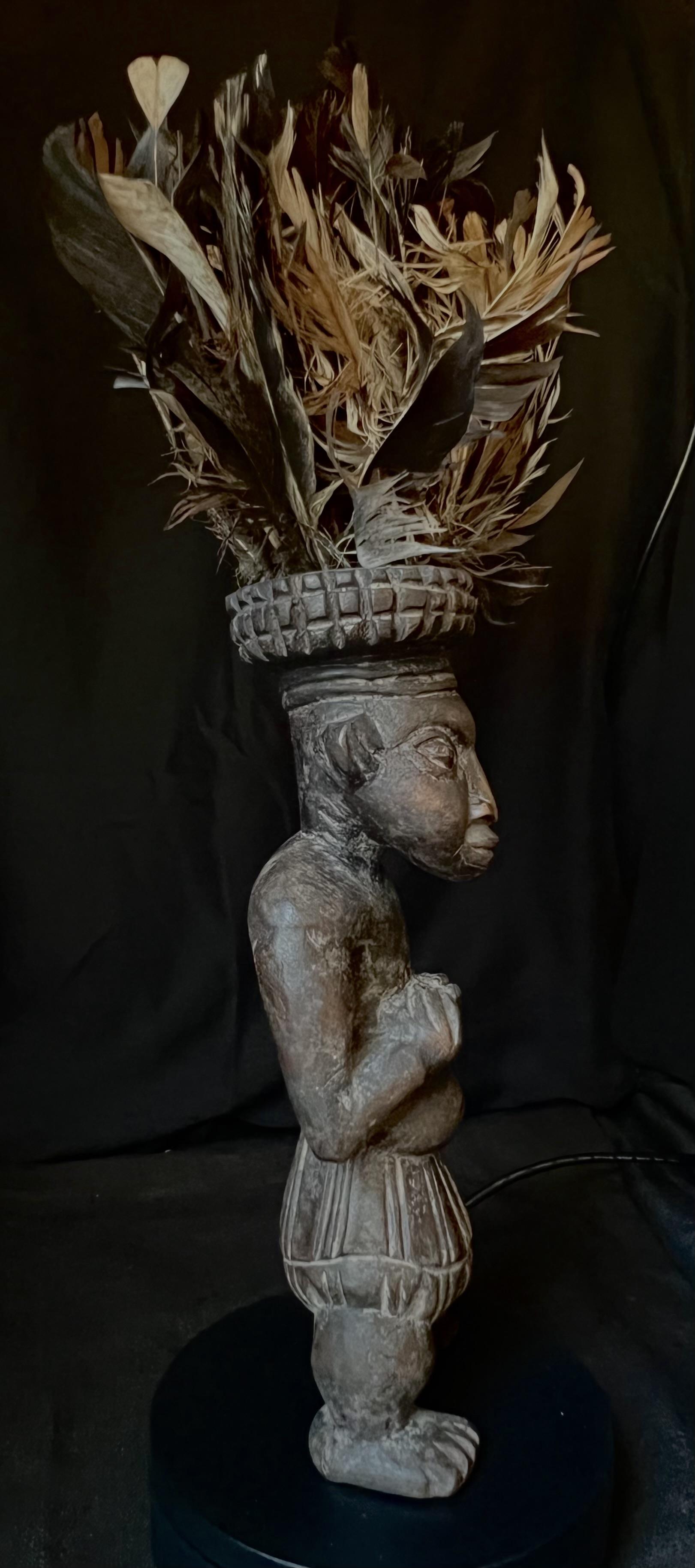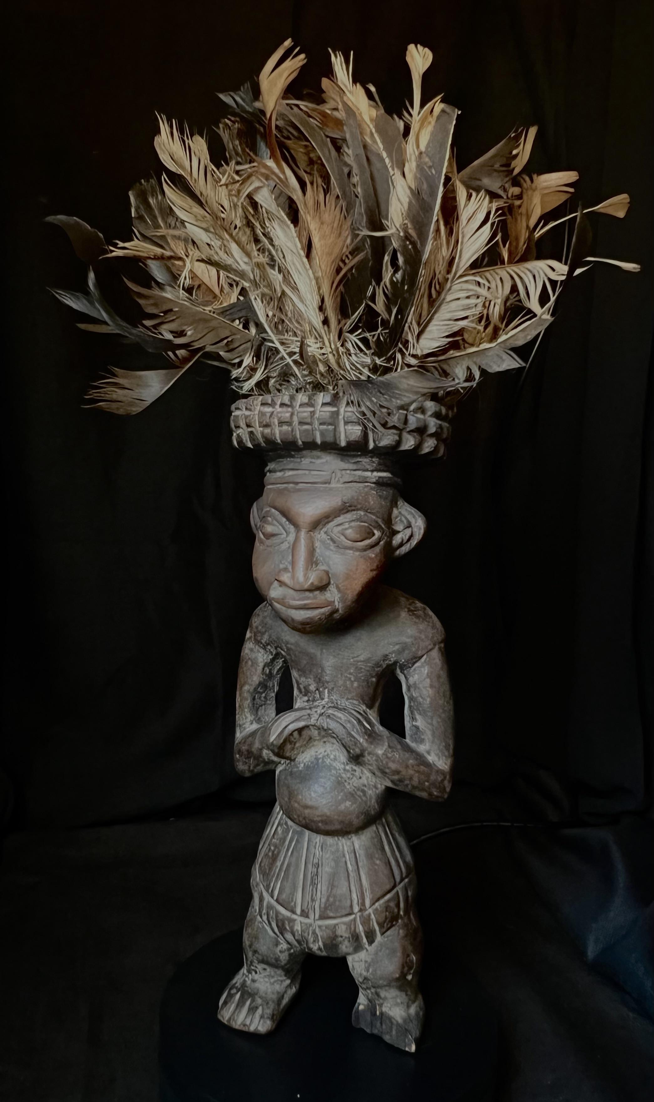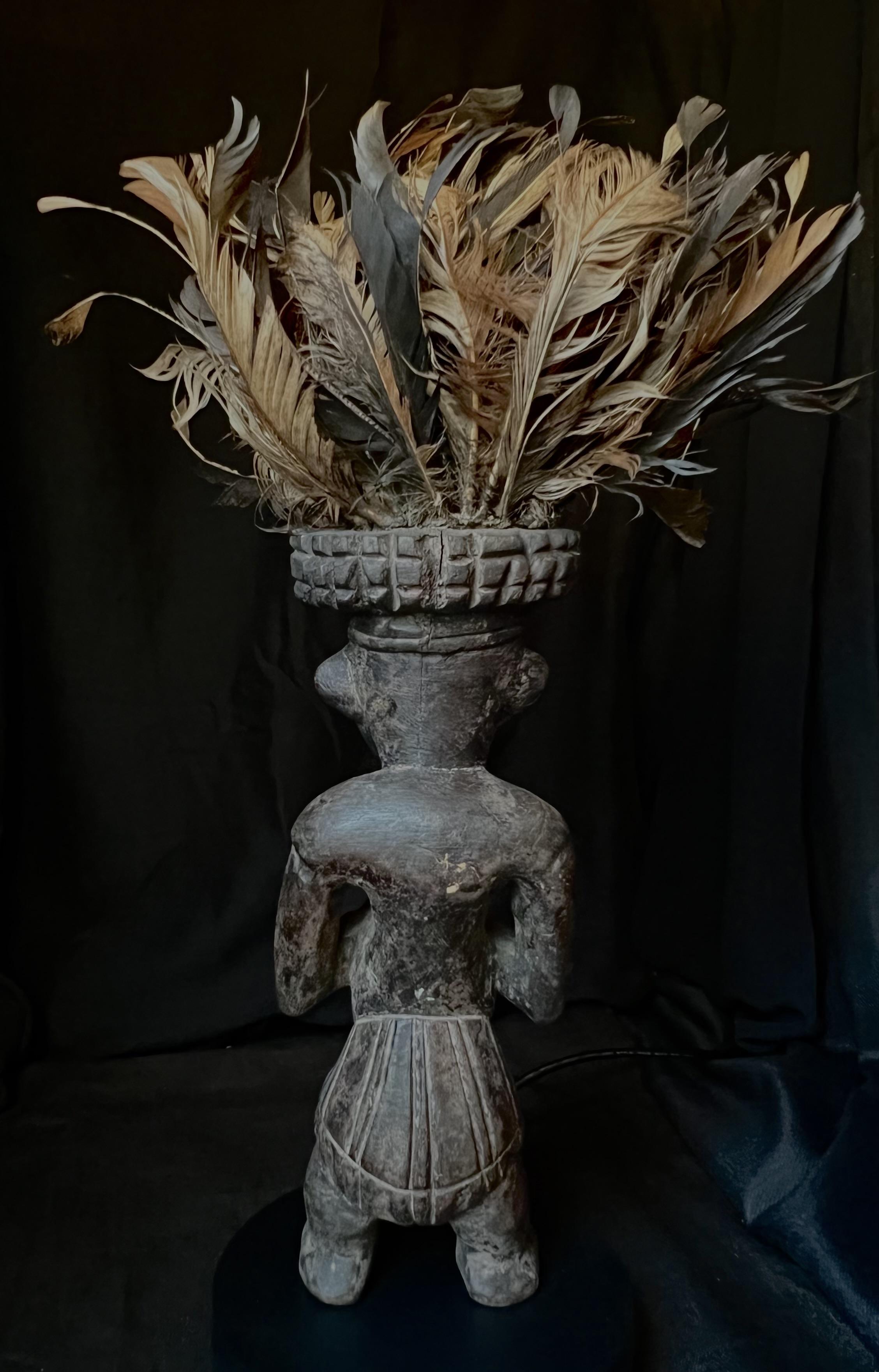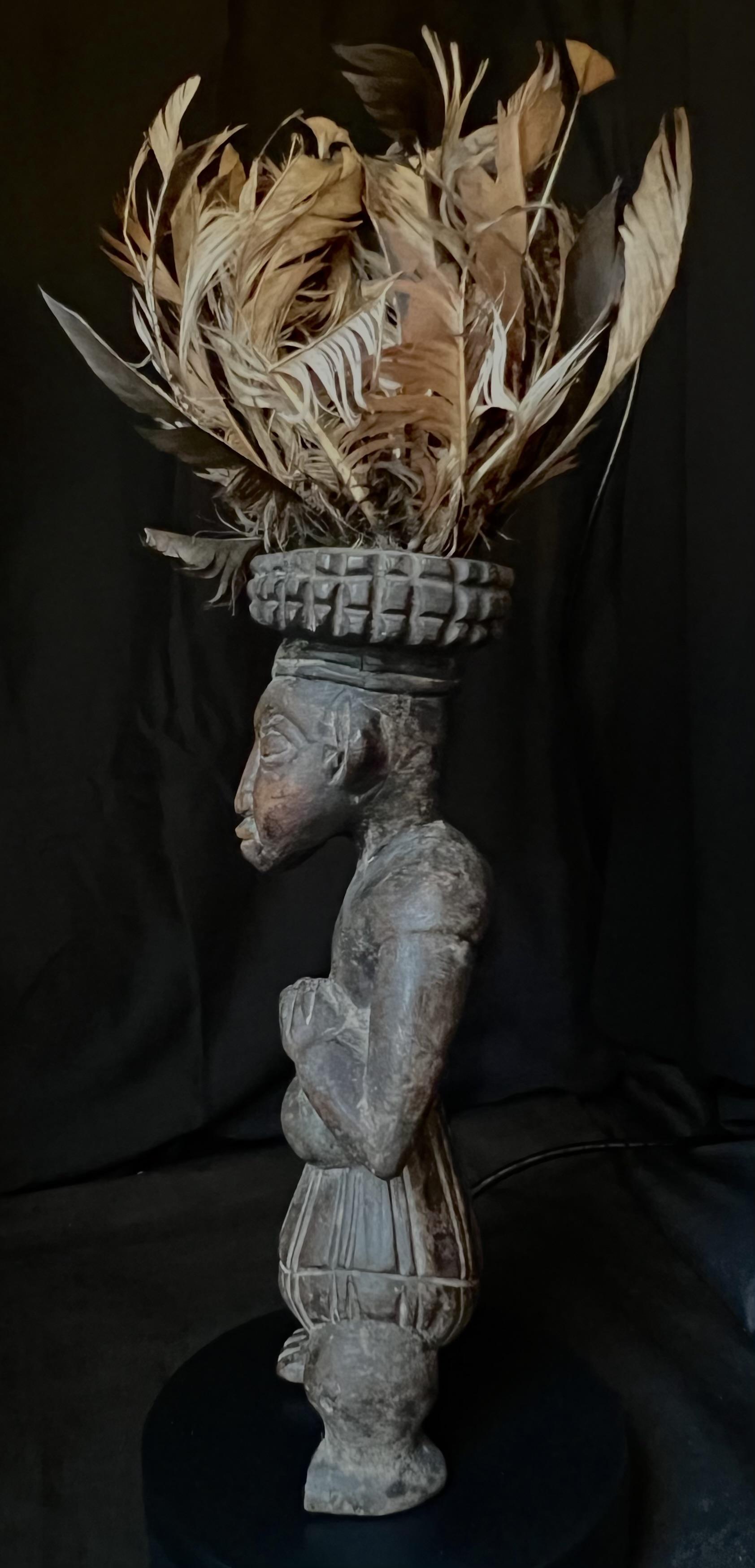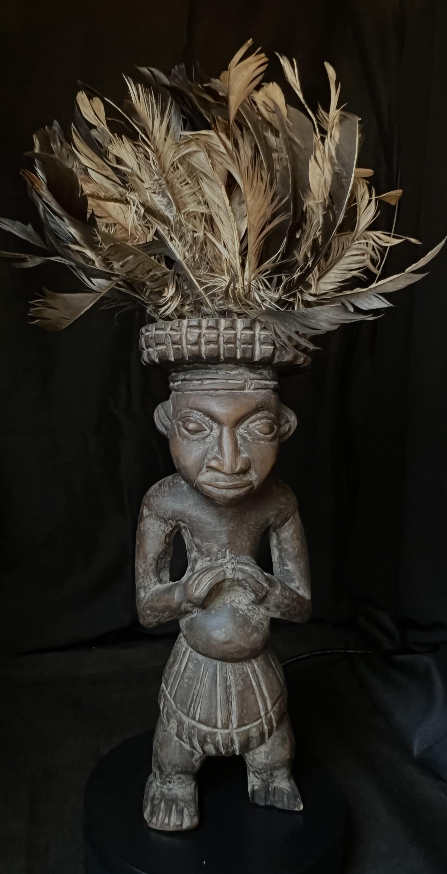 En meget dyktig sk[ret figur fra Tikarfolket, som har tjent som en personlig beskyttelses fetisj. Fj’rpynten p[ hodet og sm[ t;rkesprekker vitner om alder og bruk, men figuren er ellers i meget god stand bortsett fra en skadet fot. Veldig typiske trekk fra folkegruppen.