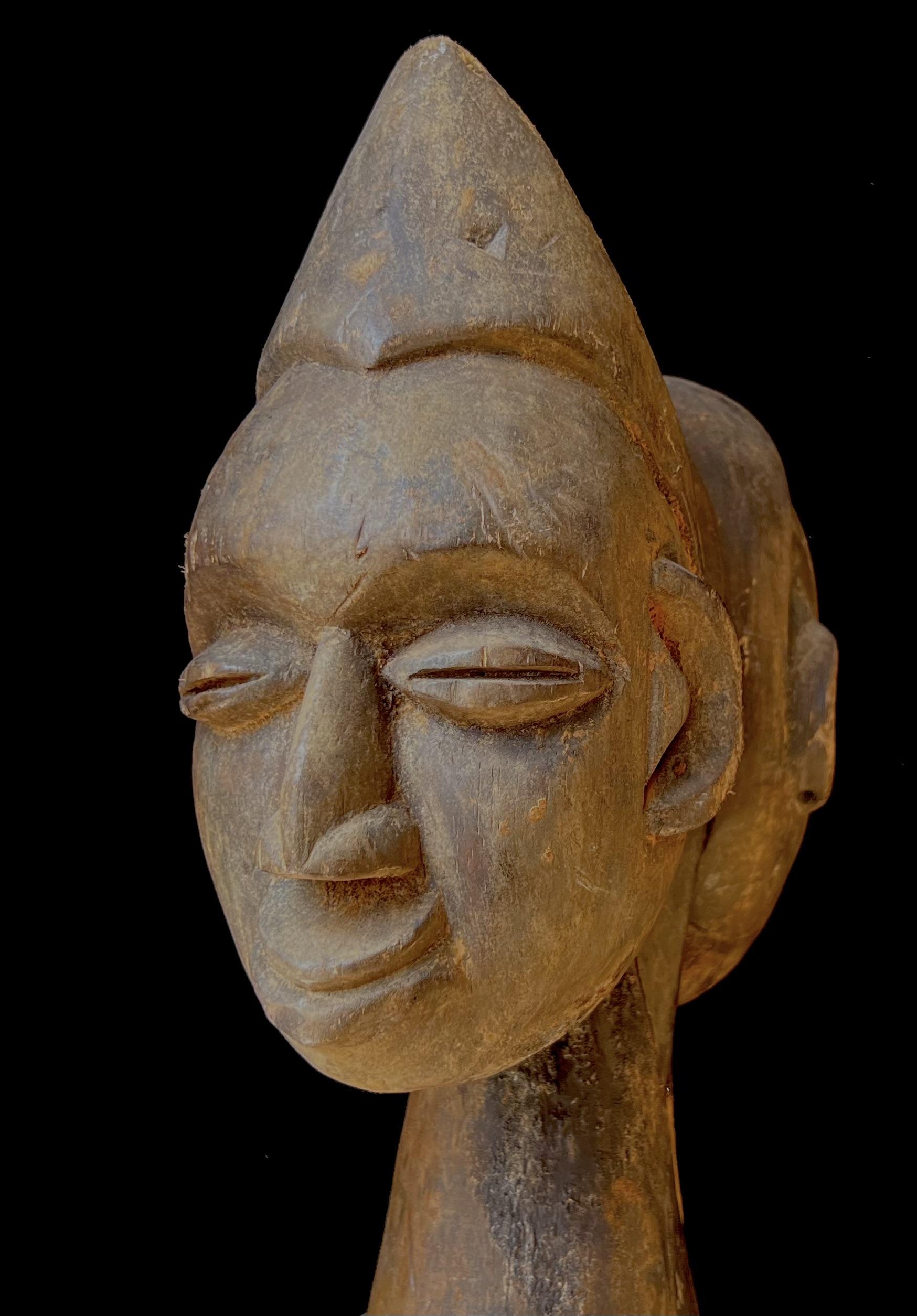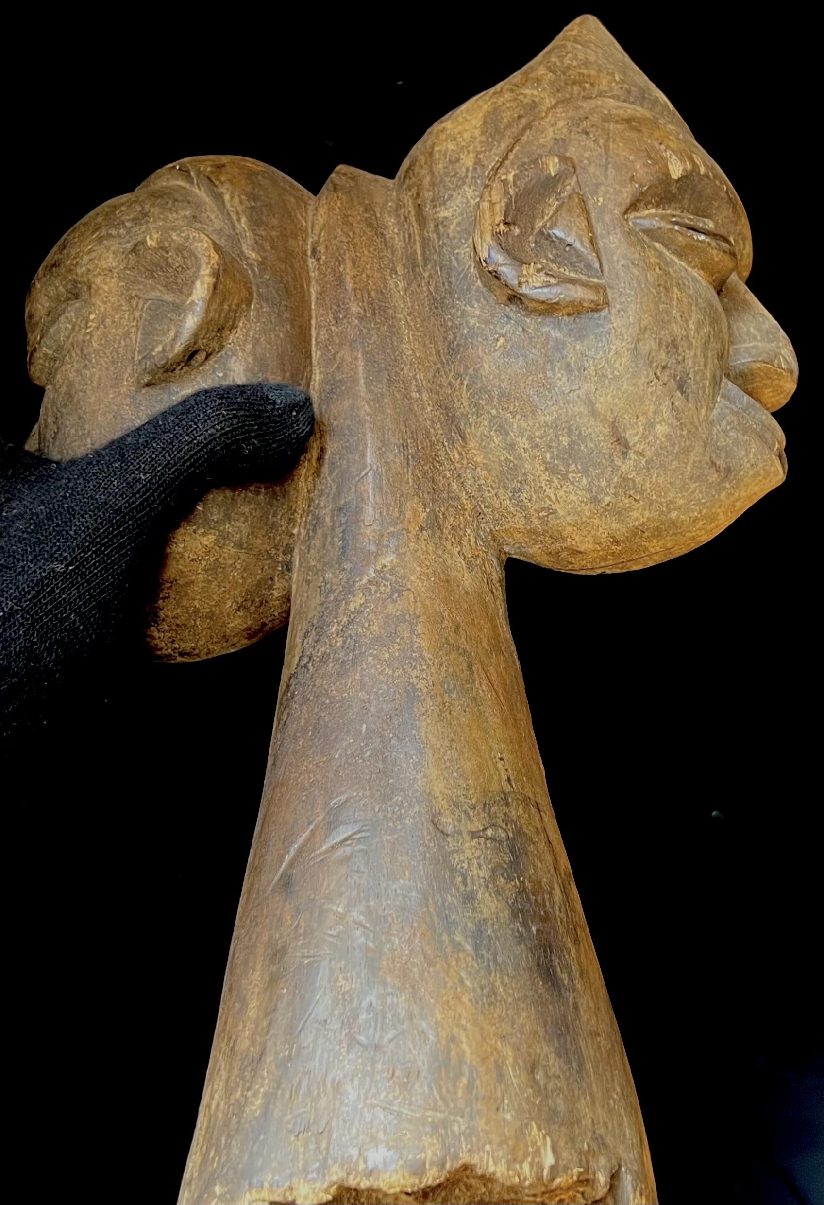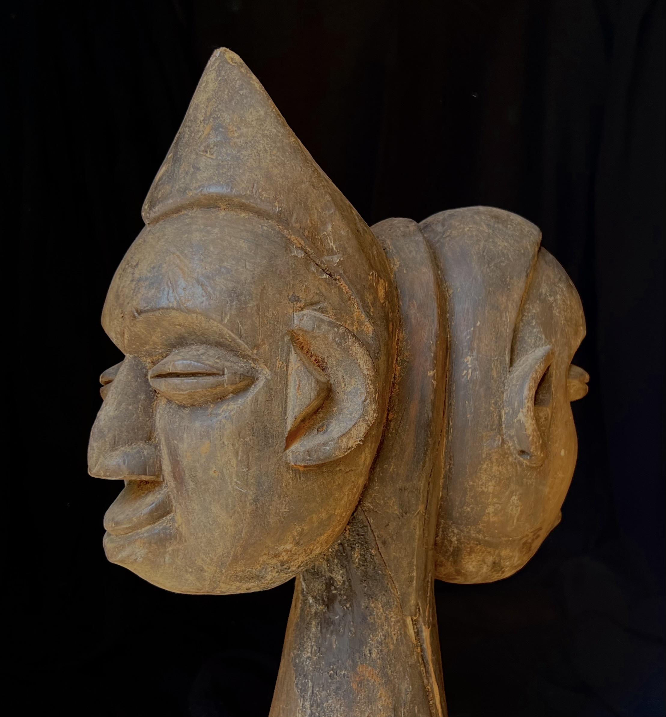 Dyktig utfort Janusfigur med to uttryksfulle hoder. I god stand med tydelige spor av alder og bruk.