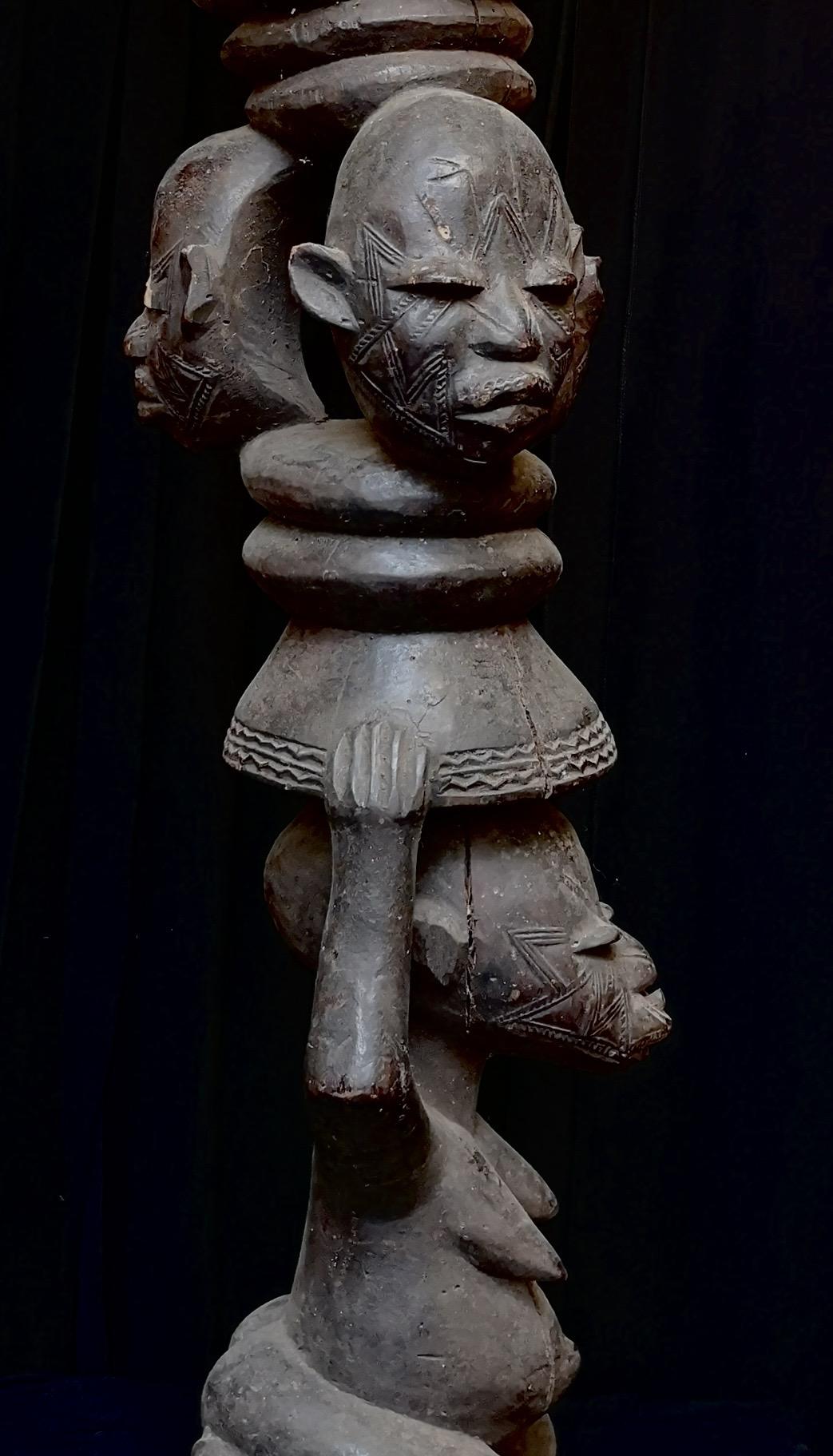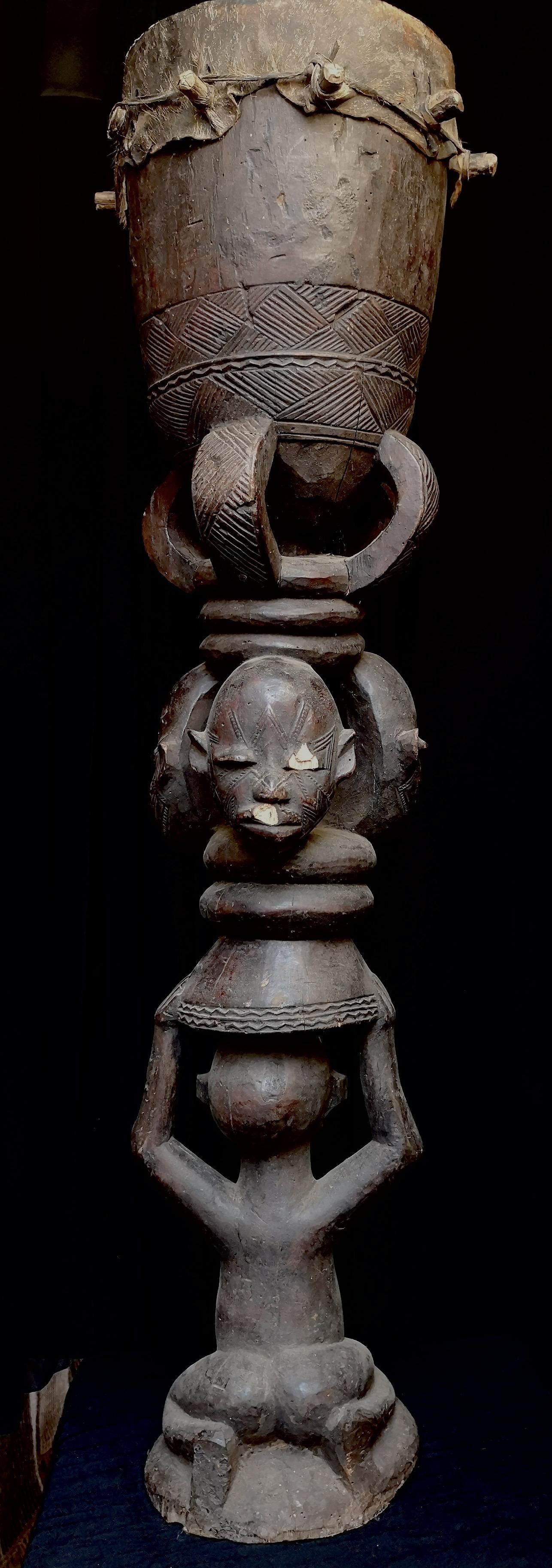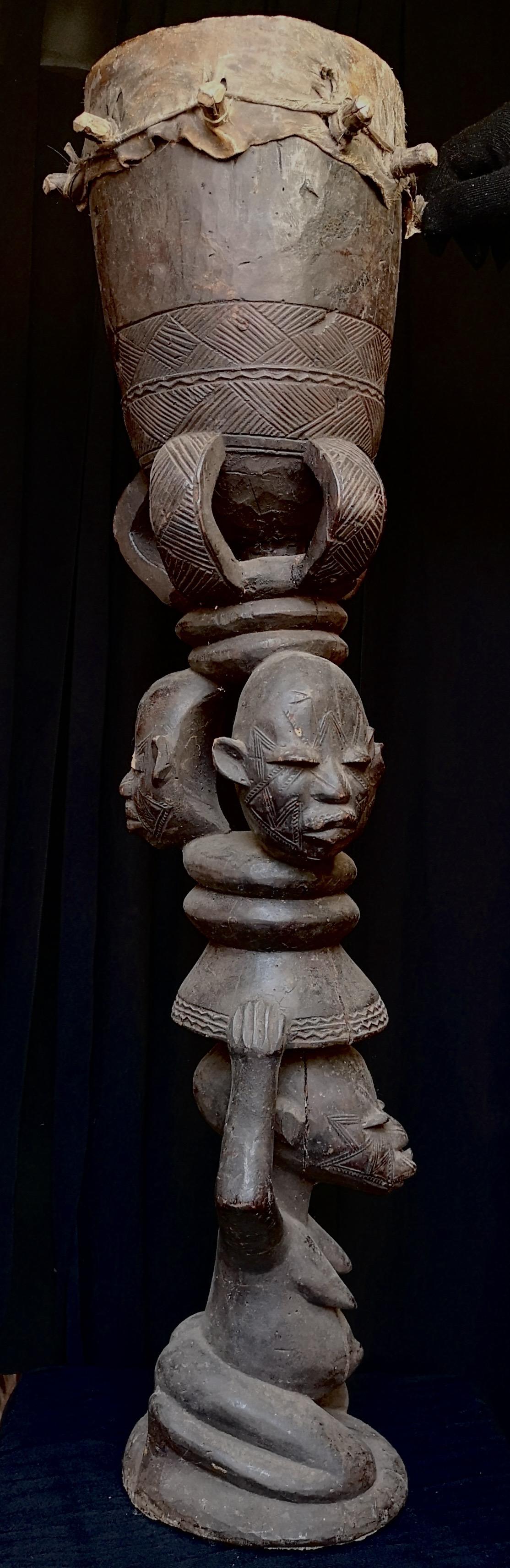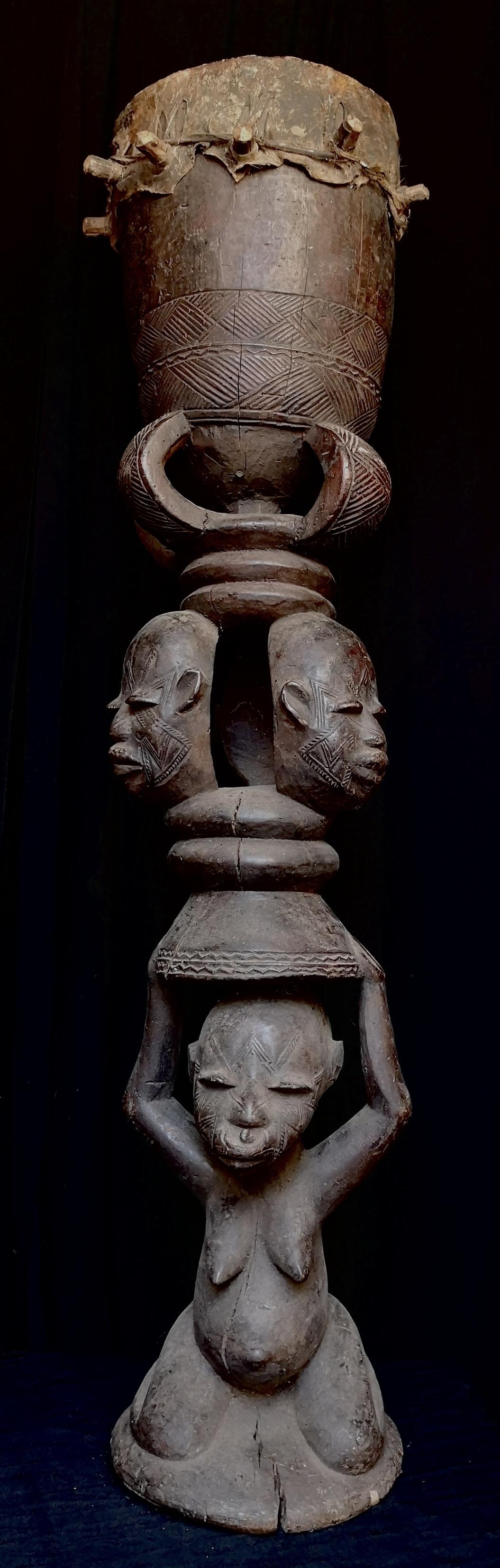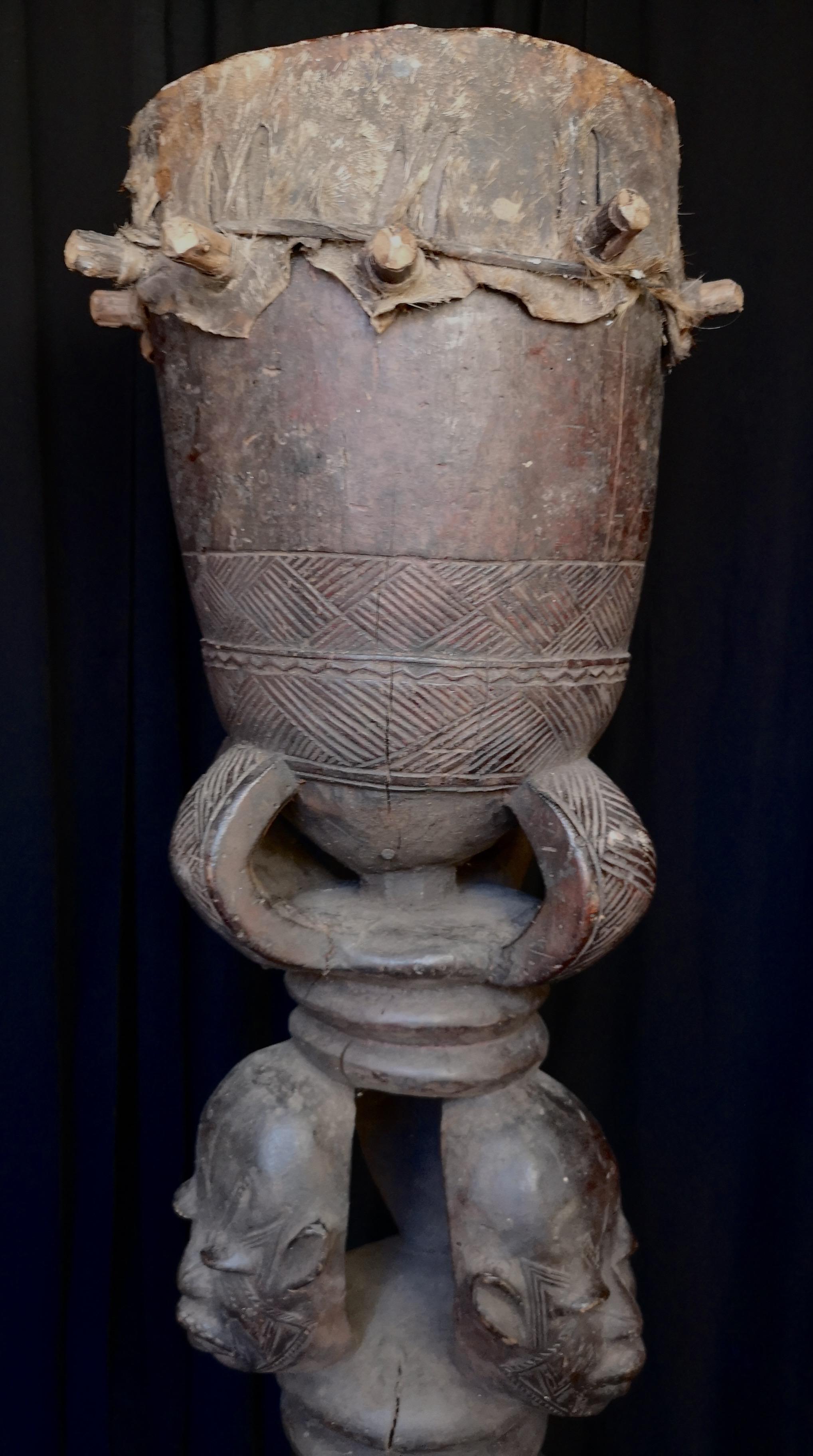 En usedvanlig vakker og vellaget tromme fra SENUFO folket i Elfenbenskysten. Her er mange flotte detaljer og elementer skåret ut av ett trestykke, med et fullt brukbart trommeskinn. Trommen er gammel og velbrukt, men tross noen små skader (på ett av hodene) som kan sees på bildene, er trommen i meget god stand. Dette er et sjeldent objekt!