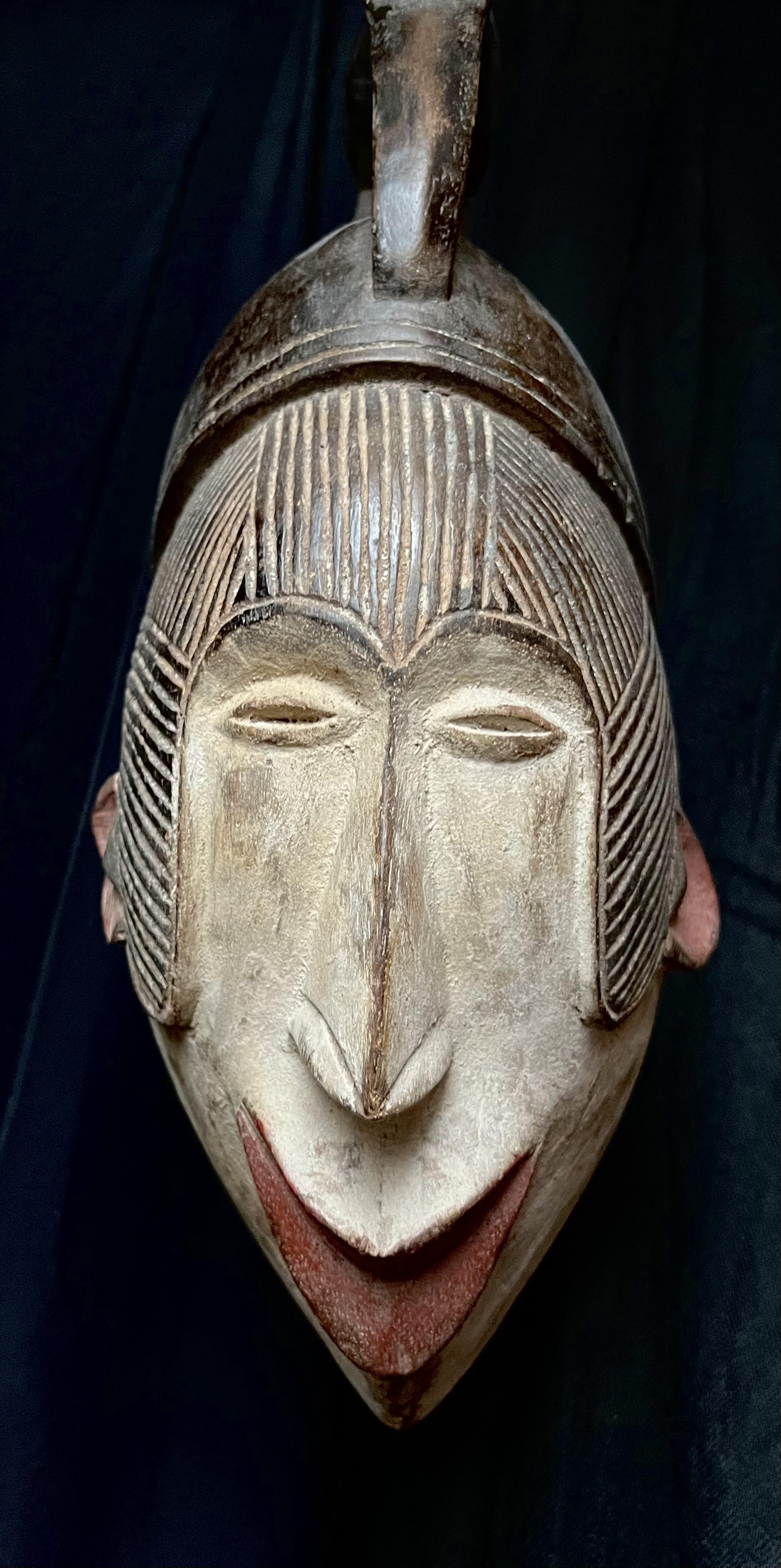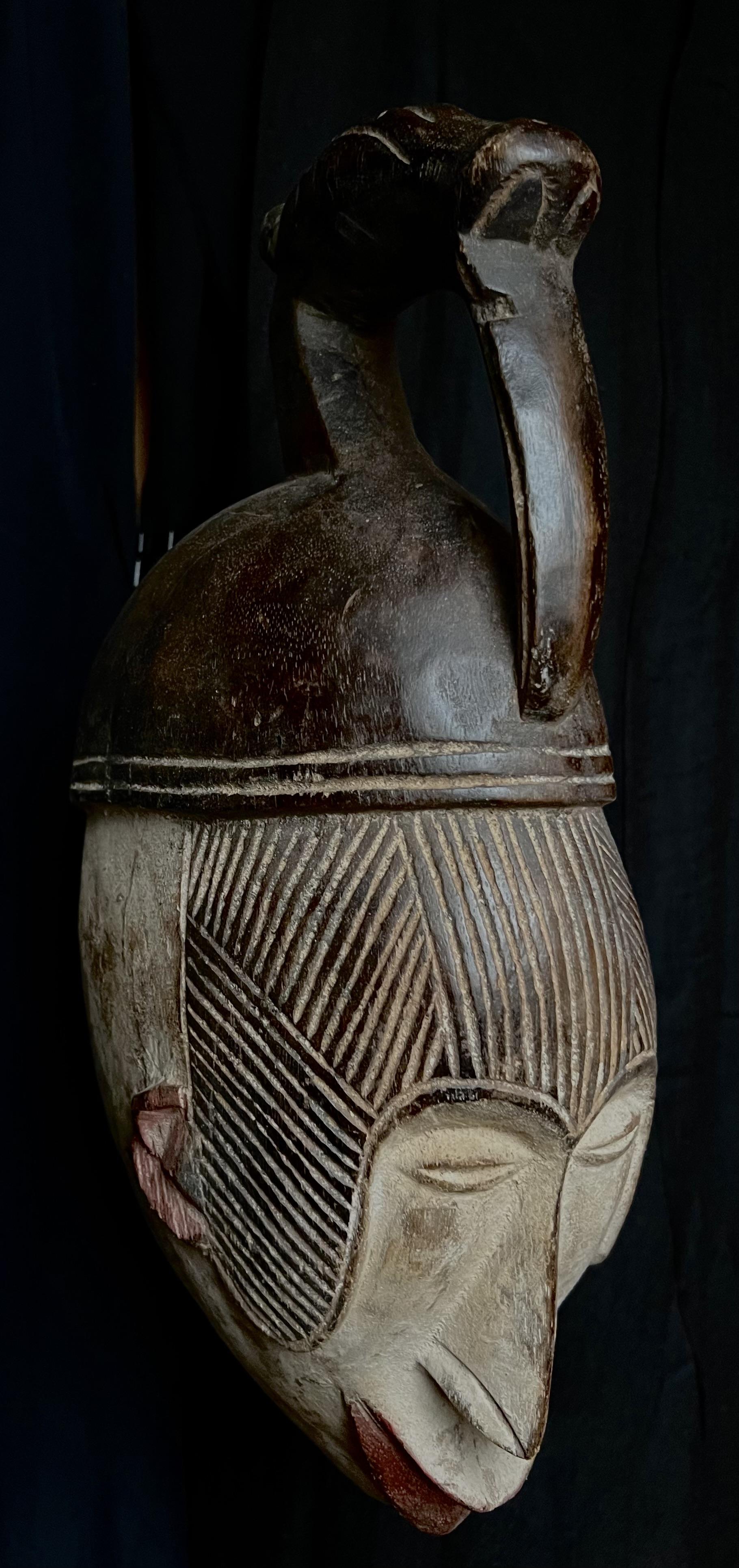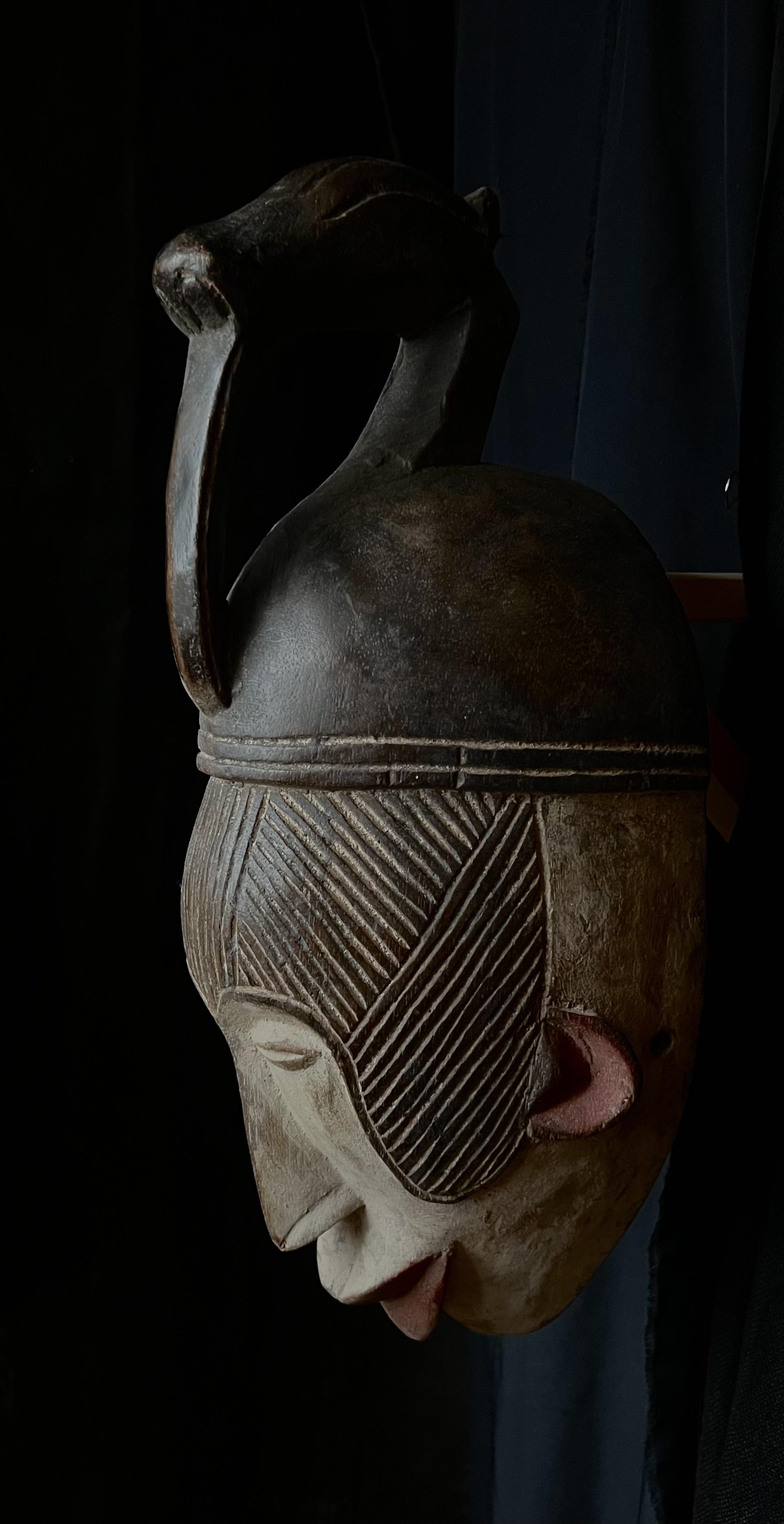 Mask representing the spirit of a young girl; Her shape, physiological features, scarifications, facial decorations and intricate hairstyle are all characteristic elements of the ideal female beauty among the Igbos. The young people of the society of the "mmwo spirits" wore these masks during the initiation ceremony of the young girls, to instruct and educate the young people not only in moral conduct but also in the canons of physical beauty, which in reality reflect the ethics of the person. Thus also, height, correct posture, a fine and straight nose, a small mouth symbolize generosity, purity, obedience and good character. These dances also took place during the harvest and during the dry season, for the festival of the goddess of the Earth in the hope of a rich and abundant harvest.
