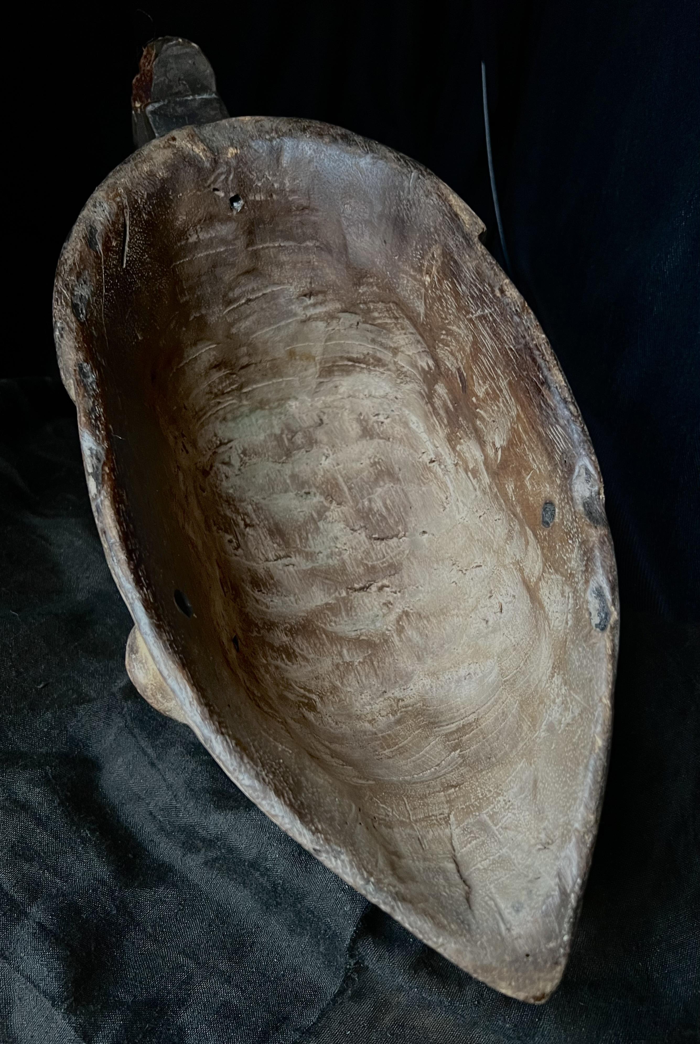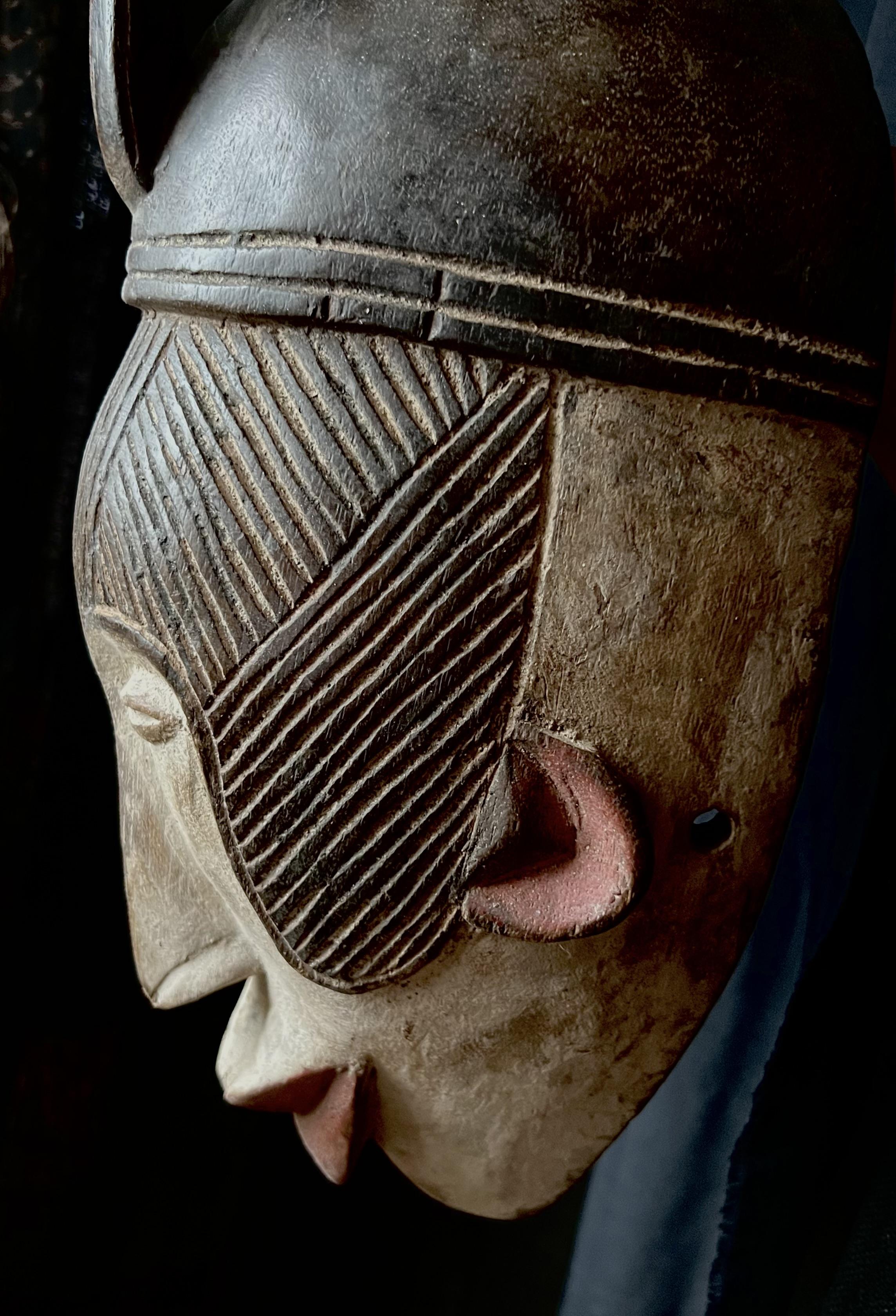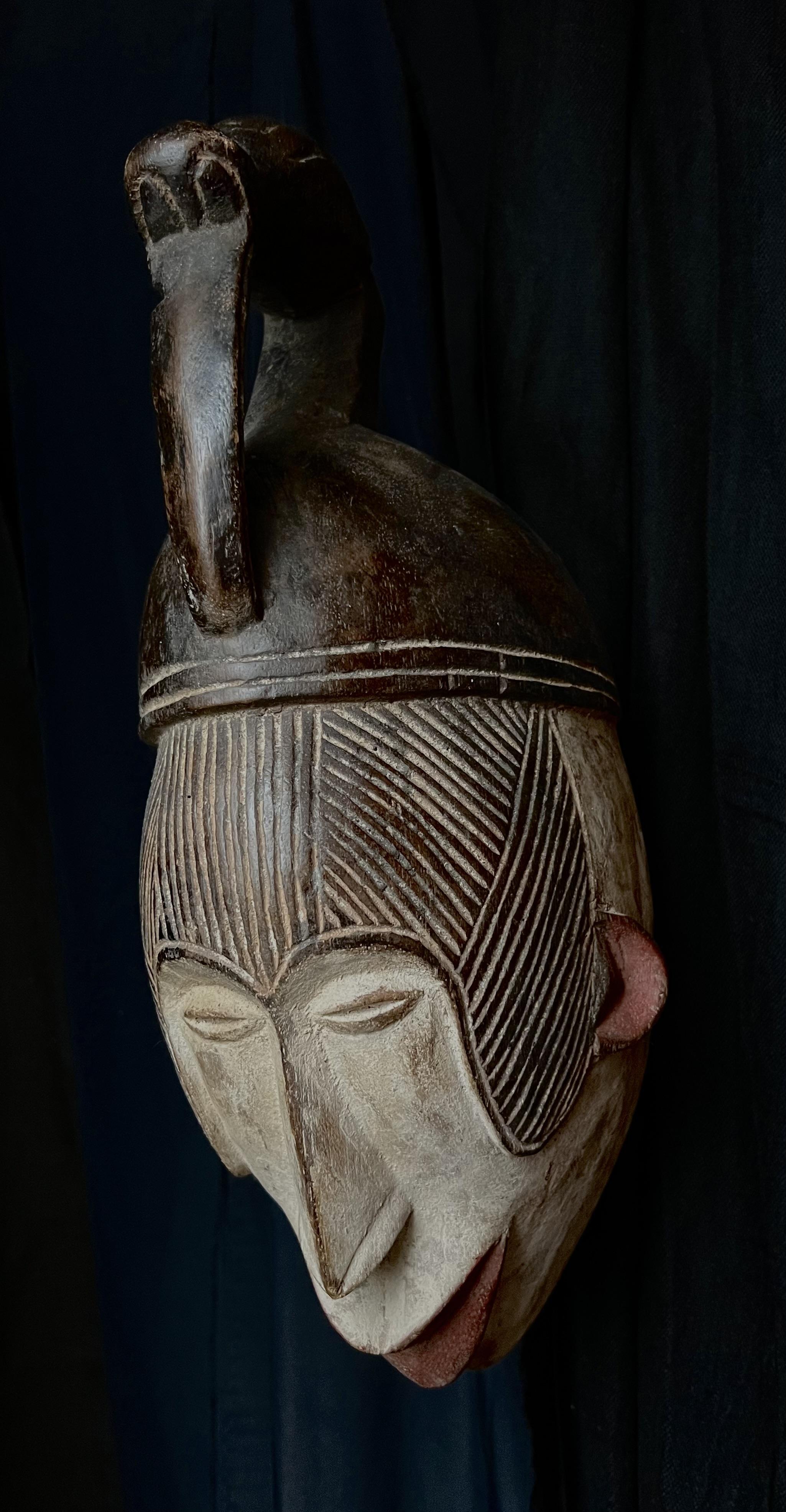 Mask representing the spirit of a young girl; Her shape, physiological features, scarifications, facial decorations and intricate hairstyle are all characteristic elements of the ideal female beauty among the Igbos. The young people of the society of the "mmwo spirits" wore these masks during the initiation ceremony of the young girls, to instruct and educate the young people not only in moral conduct but also in the canons of physical beauty, which in reality reflect the ethics of the person. Thus also, height, correct posture, a fine and straight nose, a small mouth symbolize generosity, purity, obedience and good character. These dances also took place during the harvest and during the dry season, for the festival of the goddess of the Earth in the hope of a rich and abundant harvest.