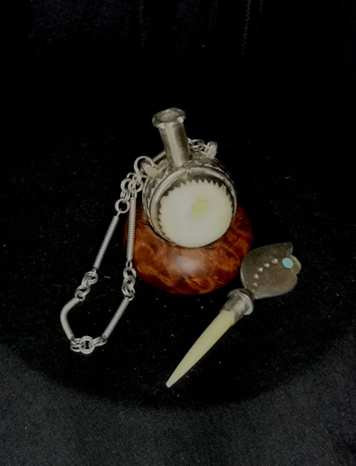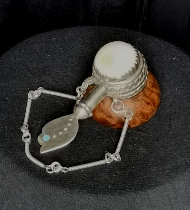 Meget vellaget og forseggjort kayalflaske, av en mestersølvsmed fra HighAtlasfjellene i Marokko. Sølv og bein. Kan også brukes som smykke.