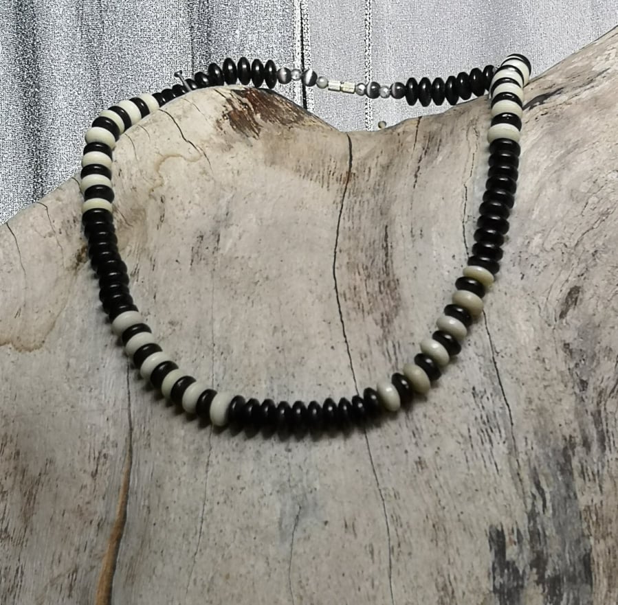 Vakkert og enkelt halskjede laget av tre- og beinperler. Ukjent opphavsland.