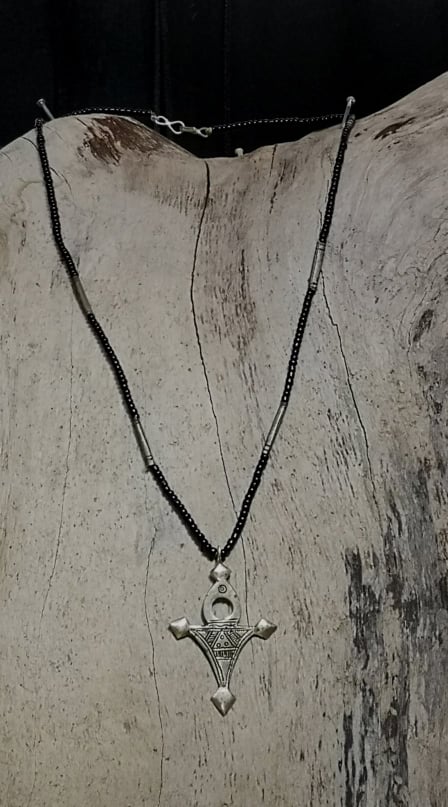 Lite, Tuareg halssmykke i meget god utførelse, sølv med tradisjonelt kjede av svarte glassperler.  (Fra Marokko eller Mali?)