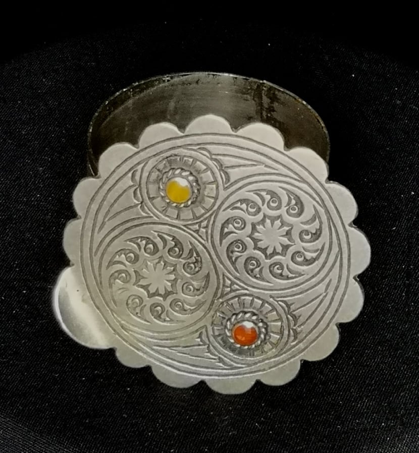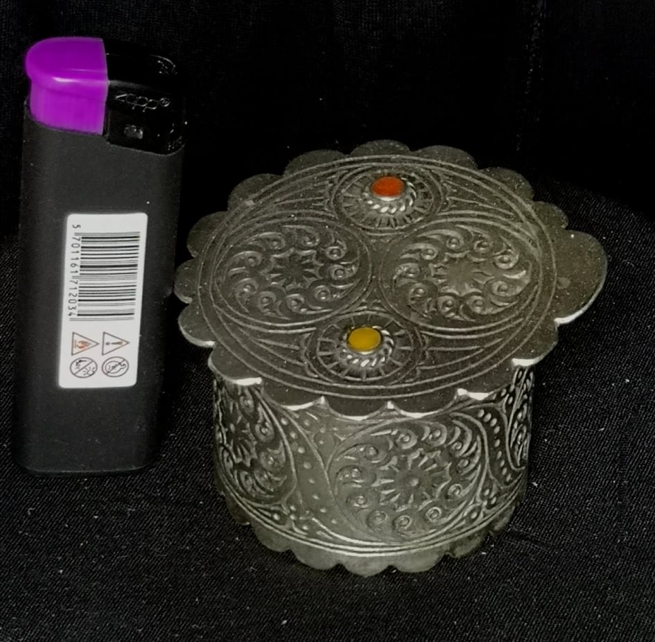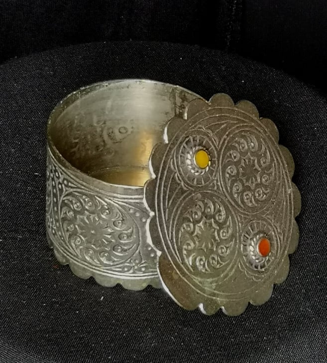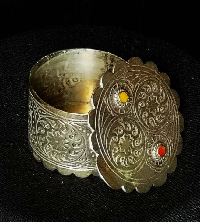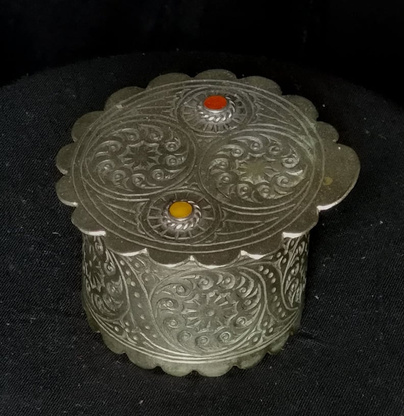 Vakker, liten sølvboks fra Marokko, laget av en mester fra en gammel sølvsmedfamilie fra Ourikadalen i SørMarokko.Â